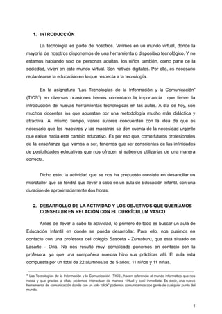 El microtaller tuvo como objetivo introducir las TIC en el aula de Educación Infantil. Constó de cuatro partes: 1) ver un cuento para aprender sobre animales, 2) crear caretas de animales trabajando la motricidad y creatividad, 3) sacar fotos con las caretas usando una cámara para fomentar el trabajo en equipo y aprender sobre fotografía, y 4) ver las fotos en el ordenador para que aprendan sobre el potencial de las TIC. El microtaller buscó que los niños se familiaricen
