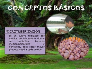 Este documento describe el proceso de micropropagación para producir microtubérculos de papa. Involucra la multiplicación masiva de plantas de papa in vitro y el desarrollo de microtubérculos en un medio especial de cultivo bajo oscuridad y a 20°C. Los microtubérculos cosechados se utilizan como semilla para garantizar el brotamiento en el invernadero o campo.
