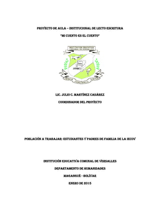 Este documento presenta un proyecto de lectura y escritura llamado "Mi cuento es el cuento" dirigido a estudiantes y padres de familia de una escuela en Colombia. El proyecto busca desarrollar habilidades comunicativas a través de actividades que involucran la lectura y escritura. Se enfoca en crear un ambiente que promueva el interés por la lectura a través del año escolar y mejorar el rendimiento académico.