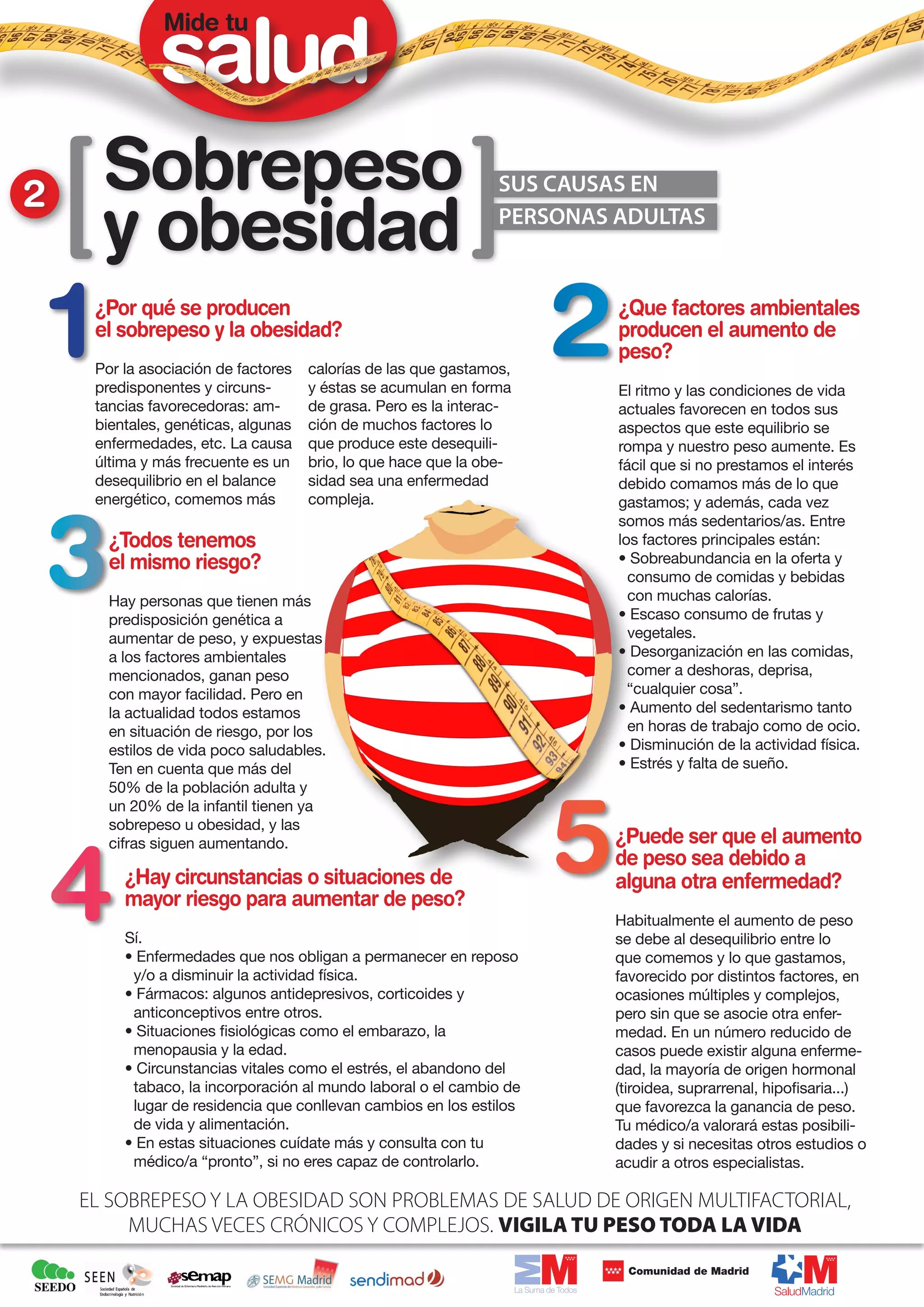 Este documento ofrece información sobre cómo medir el sobrepeso y la obesidad, sus causas, consecuencias para la salud y formas de prevención y tratamiento. Explica que el sobrepeso y la obesidad se miden principalmente a través del índice de masa corporal y el perímetro de la cintura. Detalla los factores ambientales, genéticos y de estilo de vida que contribuyen al exceso de peso, así como los riesgos que plantea para la salud, como la diabetes y las enfermedades cardíacas. Finalmente,