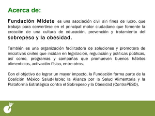 La Fundación Mídete es una organización sin fines de lucro que trabaja para promover una cultura de educación, prevención y tratamiento del sobrepeso y la obesidad en México. La Fundación informa al público sobre los riesgos de la obesidad, sensibiliza a los tomadores de decisiones e implementa soluciones integrales, trabajando tanto para impulsar cambios sistémicos como para promover hábitos de vida más saludables entre la población.
