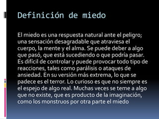 El miedo es una respuesta natural ante el peligro que puede manifestarse tanto de forma racional como irracional, generando reacciones fisiológicas en el cuerpo. Si bien es una emoción necesaria para la supervivencia, también puede llevar a consecuencias negativas como taquicardia y pérdida de control. Enfrentar y naturalizar el miedo, así como buscar ayuda profesional ante miedos extremos, son pasos importantes para superarlo.