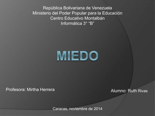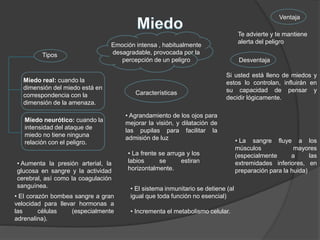 Este documento resume los tipos de miedo, las características fisiológicas del miedo y sus ventajas y desventajas. Explica que existen el miedo real y el miedo neurótico, y describe cómo el miedo aumenta la presión arterial, la glucosa en la sangre y la actividad cerebral. También detalla cómo el miedo prepara al cuerpo para la huida redistribuyendo la sangre y dilatando las pupilas.