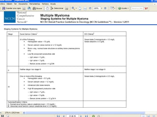 El mieloma múltiple es un desorden neoplásico de las células plasmáticas que se caracteriza por una proteína monoclonal en sangre u orina, infiltración de la médula ósea y daño a órganos. Su incidencia aumenta con la edad y su etiología es desconocida. El diagnóstico requiere más del 10% de células plasmáticas en la médula ósea, una proteína monoclonal y compromiso de órganos. El tratamiento incluye quimioterapia con agentes como b