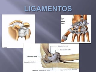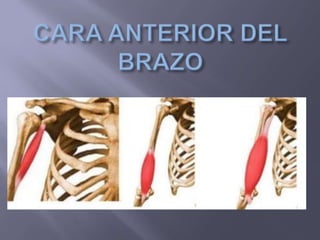 El documento describe la anatomía del miembro superior, incluyendo los músculos del hombro, brazo, antebrazo y mano. Se describen los orígenes, inserciones, inervaciones y funciones de más de 30 músculos. También se describen tres ligamentos clave de la articulación glenohumeral: el ligamento coracoclavicular, el ligamento coracoacromial y el anillo fibroso de la articulación del codo.