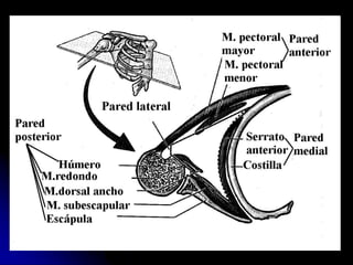 El documento resume las principales regiones y estructuras del miembro superior humano. En 3 oraciones: La región incluye la cintura escapular, hombro, axila, brazo, antebrazo y mano. La cintura escapular contiene huesos como la clavícula y escápula, y músculos como el deltoides y redondos. El brazo y antebrazo están rodeados por fascias y contenidos musculares en compartimientos anterior y posterior.