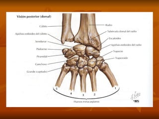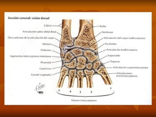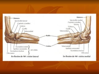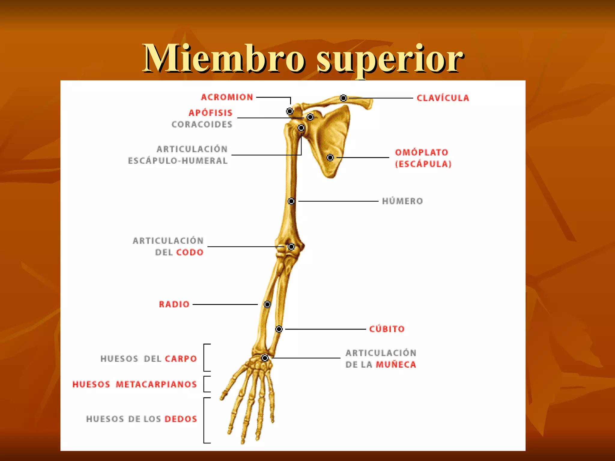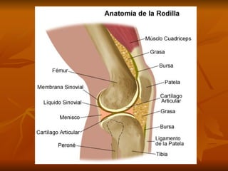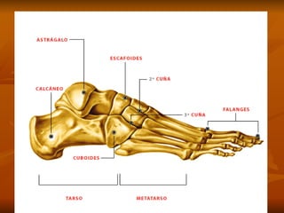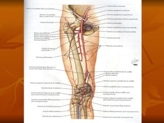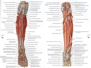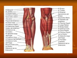 El documento describe las principales partes de los miembros superiores e inferiores del cuerpo humano, incluyendo los huesos, articulaciones y músculos. En el miembro superior se mencionan el hombro, brazo, antebrazo y mano, así como las articulaciones del hombro, codo y muñeca. En el miembro inferior se describen la pelvis, muslo, rodilla, pierna y pie, además de las articulaciones de la cadera, rodilla y tobillo. También se señalan los principales músculos y