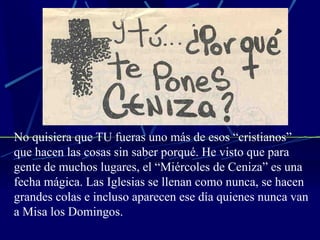 El Miércoles de Ceniza marca el inicio de la Cuaresma, un tiempo de preparación espiritual antes de la Pascua. La ceniza simboliza el arrepentimiento de los pecados y la mortalidad humana, recordándonos que sin Dios solo somos polvo. Al ponerse la ceniza, los cristianos se comprometen a vivir como Jesús, sirviendo a los demás hasta dar la propia vida, para así merecer resucitar con Él.