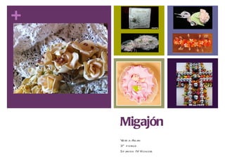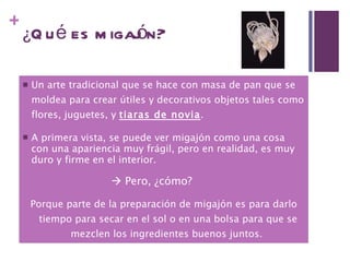 Migajón es un arte tradicional mexicano que consiste en moldear masa de pan para crear objetos decorativos como flores y figuras. Aunque la masa parece frágil, es dura por dentro luego de secar al sol o en bolsas. Actualmente, las flores de migajón son populares, especialmente en bodas donde adornan vestidos y velos de novia.