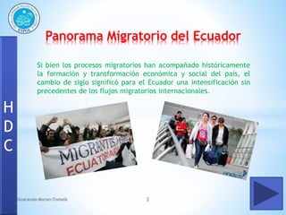 El documento describe la migración en Ecuador. Históricamente, los procesos migratorios han acompañado el desarrollo económico y social del país, pero a finales del siglo XX hubo una intensificación sin precedentes de los flujos migratorios internacionales debido a las crisis económicas. La emigración ecuatoriana se situó principalmente en las provincias del sur y tuvo como principal destino Estados Unidos. Aunque la migración ha traído beneficios económicos a través de las remesas, también ha causado efectos social