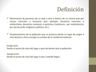 La migración tiene efectos demográficos, económicos, sociales y políticos. Demográficamente, las regiones receptoras se rejuvenecen mientras que las de origen envejecen. Económicamente, las remesas de los migrantes benefician a sus países de origen y algunos estudios sugieren que la migración reduce los salarios de los trabajadores no calificados en los países receptores. Socialmente, la integración de los migrantes plantea retos y puede haber discriminación. Políticamente, representa un desafío para los gobi