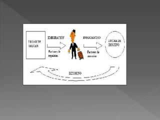 El documento trata sobre la migración en México. Explica que la migración puede ser interna, entre municipios de un mismo estado o entre estados, o externa e internacional entre países. La mayoría de los migrantes económicos mexicanos que van a otros países tienen entre 20 y 34 años. El INM es la institución que regula la migración en México y trabaja para gestionar el flujo migratorio de manera eficiente y respetuosa de los derechos humanos. Uno de los principales problemas de México es el gran flujo migratorio hacia Estados Un