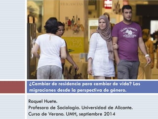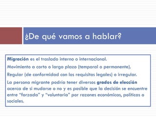 Este documento resume una presentación sobre las migraciones desde una perspectiva de género. Explica que aproximadamente la mitad de los 232 millones de migrantes internacionales en el mundo son mujeres, y que las mujeres migran principalmente por razones económicas para apoyar a sus familias, aunque también por motivos personales o de estilo de vida. Además, destaca que las mujeres migrantes a menudo enfrentan estereotipos y prejuicios.