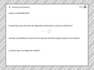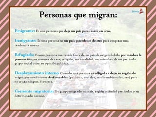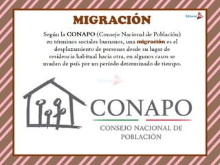 La Migracion es el movimiento, desplazamiento o traslado de gente de un lugar a otro del mundo con el propósito de establecer una residencia de manera permanente o semipermanente, normalmente desencadenando por una frontera política. Según la CONAPO (Consejo Nacional de Población) en términos sociales humanos, una migración es el desplazamiento de personas desde su lugar de residencia habitual hacia otra, en algunos casos se mudan de país por un período determinado de tiempo. Cuando un gobierno obliga a un grupo grande de personas a salir de una región, normalmente basándose en su etnia o religión. Esto también se conoce con el nombre de migración involuntaria o forzosa. Sin embargo cuando los individuos no son forzados a salir del país, pero terminan marchándose por la situación desfavorable como guerras, problemas políticos, o persecuciones religiosas. Se le conoce como migración "reacia" o "impuesta".