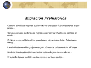 El documento resume la historia de la migración humana a través de los tiempos, incluyendo migraciones prehistóricas, conquistas que llevaron a transferencias de población, la era de exploración y colonización, el impacto de la revolución industrial, y migraciones más recientes como resultado de las guerras mundiales y conflictos. También discute temas como la esclavitud, el trabajo contractual, y la migración actual en Ecuador de emigrantes, inmigrantes, y refugiados.