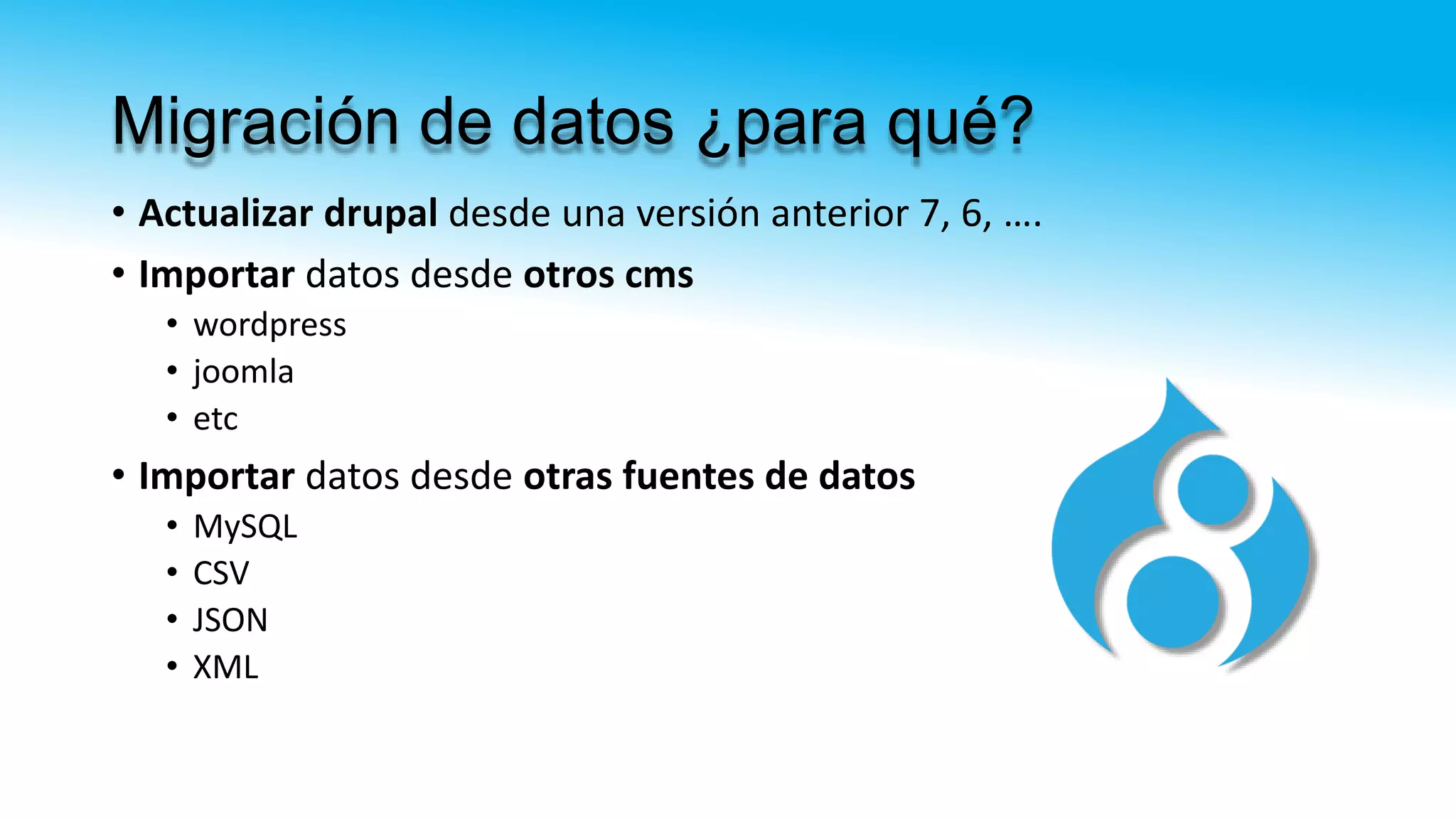 Este documento describe cómo migrar datos entre versiones de Drupal, incluyendo de Drupal 7 a Drupal 8. Explica las herramientas disponibles como migrate_drupal y migrate_upgrade, así como cómo programar migraciones personalizadas con el módulo Migrate en Drupal 8.
