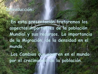 La presentación trata sobre las características principales de la población mundial, incluyendo la migración, densidad y crecimiento poblacional. Define conceptos clave como demografía, migración, densidad de población, volumen y censo. Explica que la densidad de población indica el número de personas por unidad de superficie, generalmente más alta en zonas urbanas, y que el crecimiento poblacional se refiere al cambio en el número de personas en el tiempo.
