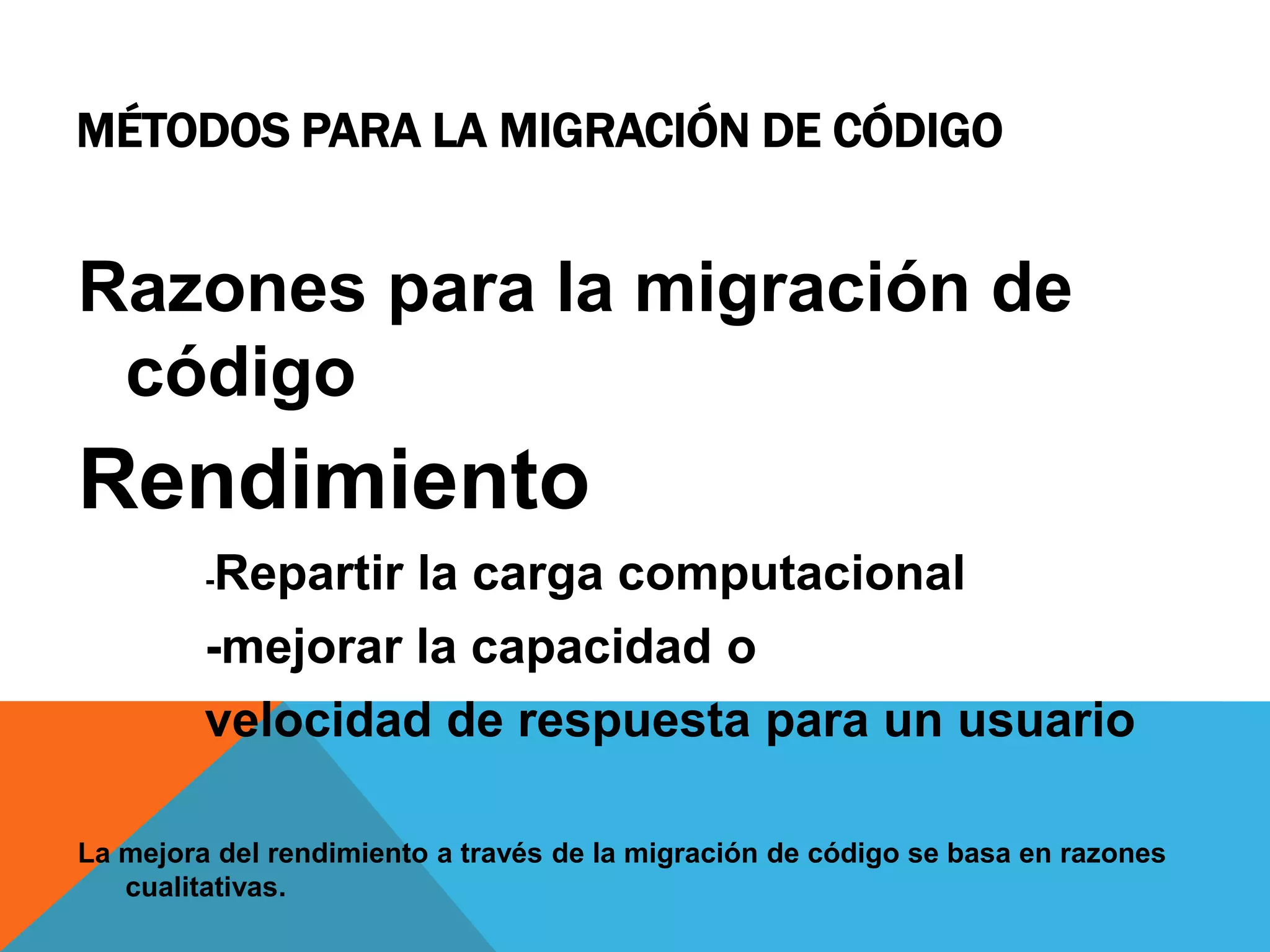 Este documento describe diferentes métodos y modelos para la migración de código entre máquinas. Explica que existen diferentes tipos de movilidad dependiendo de qué segmentos del proceso migran, si es iniciado por el remitente o destinatario, y si la ejecución ocurre en el proceso de destino o uno separado. También discute los desafíos de migrar recursos y código entre sistemas heterogéneos.