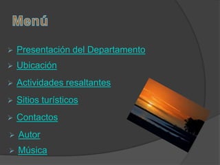 El documento presenta información sobre el departamento de Cordillera en Paraguay. Ubicado en el centro oeste del país, limita con varios departamentos y su capital y ciudad más poblada es Caacupé. Destaca sitios turísticos como Atyra, Emboscada y Caacupé, que celebran fiestas patronales, y actividades como la Peregrinación a Caacupé y paseos por la Ruta Tukangua. Proporciona contactos de la gobernación y empresas de transporte para llegar a las ciudades del departamento.