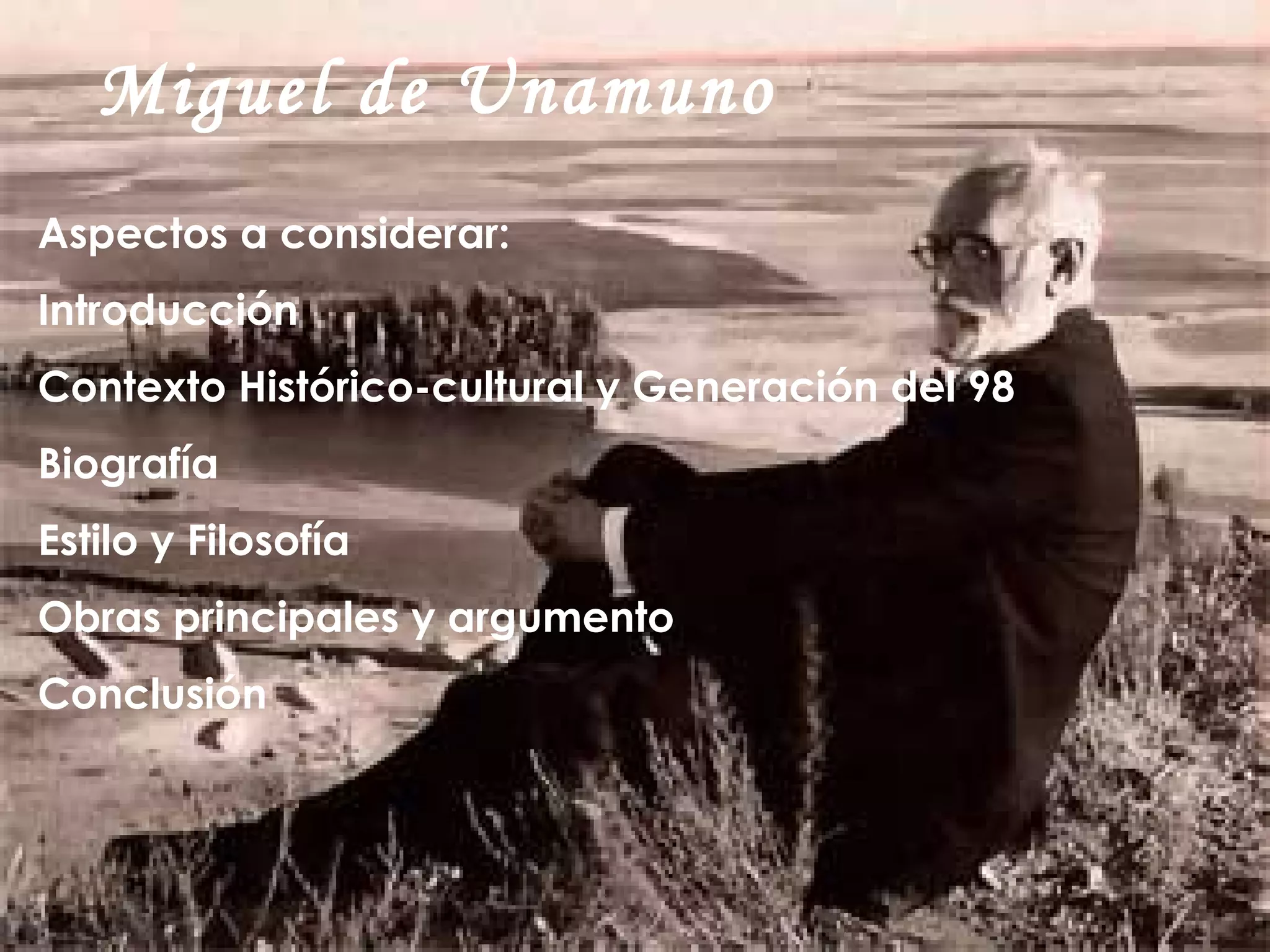 Miguel de Unamuno fue un escritor español del siglo XX asociado con la Generación del 98. Cultivó diversos géneros literarios como novela, ensayo y teatro. Se le considera uno de los primeros escritores existencialistas modernos y exploró temas como la muerte, la inmortalidad y el futuro de España. Algunas de sus obras más destacadas incluyen Nieve, De Fuerteventura a París y Sombras de sueño.