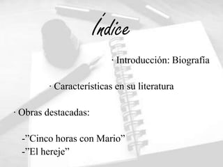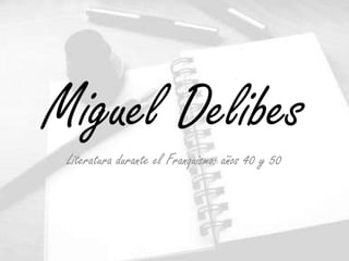 Miguel Delibes fue un escritor español del siglo XX conocido por sus novelas durante el franquismo. Sus obras destacadas exploran temas sociales y religiosos de forma realista y no política, incluyendo "Cinco horas con Mario" sobre una mujer que vela el cuerpo de su marido y "El hereje" sobre un hombre quemado en la hoguera por herejía. Delibes usó la novela experimental para rehumanizar al hombre a través de la naturaleza y valores cristianos.