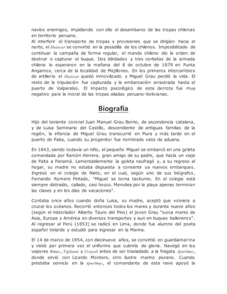1) Miguel Grau fue un almirante peruano que destacó en la Guerra del Pacífico entre Perú y Chile por su liderazgo y heroísmo a bordo del monitor Huáscar.