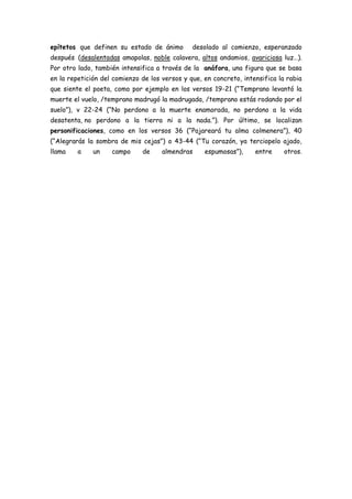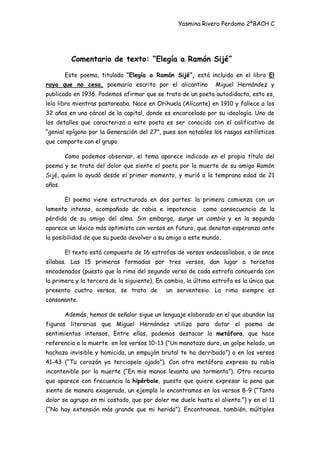 Este documento resume un poema de Miguel Hernández titulado "Elegía a Ramón Sijé". El poema lamenta la muerte del amigo del poeta, Ramón Sijé, a la edad de 21 años. Está estructurado en dos partes, la primera expresando el dolor intenso del poeta, y la segunda más optimista con esperanza de volver a ver a su amigo. El poema usa figuras literarias como metáforas, hipérboles y personificaciones para transmitir los sentimientos intensos del poeta.