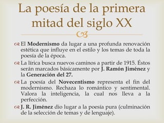 El documento presenta un resumen de la poesía de la primera mitad del siglo XX en España. Explica que el Modernismo dio paso a una renovación estética influenciada por J. Ramón Jiménez y la Generación del 27. También habla brevemente de la vida y obra del poeta Miguel Hernández, destacando sus distintos periodos poéticos y algunos de sus poemas más representativos.