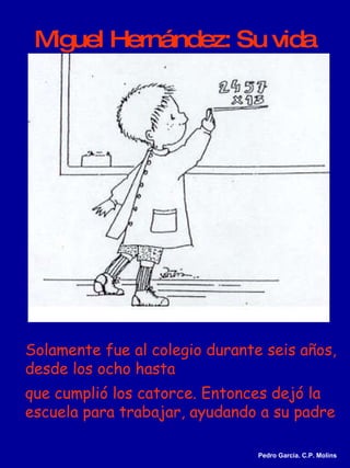 Miguel Hernández nació en 1910 en Orihuela y dejó la escuela a los 14 años para trabajar ayudando a su padre. Le gustaba escribir poemas desde pequeño. A los 21 años ganó un premio literario y se mudó a Madrid para perseguir su carrera, pero no tuvo éxito y fue detenido al regresar a casa. Más tarde se involucró en la literatura madrileña y se unió al ejército republicano durante la guerra civil, donde recitaba poemas para levantar la moral de los soldados. Tras la