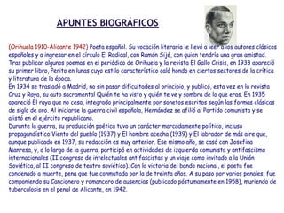Este documento presenta un breve resumen biográfico del poeta español Miguel Hernández (1910-1942). Detalla su vocación literaria desde una edad temprana, la publicación de sus primeros libros de poesía en la década de 1930 y su participación en la Guerra Civil Española como comunista y soldado republicano. También describe su encarcelamiento y muerte a causa de la tuberculosis en la cárcel de Alicante en 1942, dejando una importante obra poética publicada póstumamente.