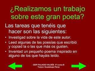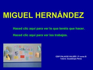 El documento proporciona instrucciones a los estudiantes de 5o curso sobre un proyecto para investigar y aprender sobre el poeta español Miguel Hernández. Se les pide que investiguen sobre su vida, lean y copien algunas de sus poesías favoritas, e inventen un poema inspirado en él. También se proporcionan enlaces a recursos biográficos y poéticos, y se indica que presentarán sus hallazgos y trabajos creativos en un cuaderno y exhibición escolar con motivo del centenario del nacimiento del poeta