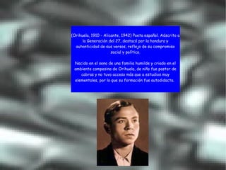 Miguel Hernández (1910-1942) fue un poeta español adscrito a la Generación del 27 conocido por la profundidad y autenticidad de sus versos, que reflejaban su compromiso social y político. Publicó su obra maestra El rayo que no cesa en 1936 y escribió poesía durante la Guerra Civil española antes de morir en prisión en 1942.