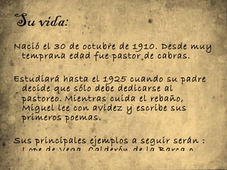 Miguel Hernández nació en 1910 en Orihuela y trabajó como pastor hasta los 15 años cuando comenzó a escribir poesía. Realizó dos viajes a Madrid para promover su trabajo, teniendo éxito en el segundo. Apoyó a la República durante la Guerra Civil y fue encarcelado por el régimen de Franco, donde escribió su famosa obra "Cancionero y Romancero de Ausencias". Hernández fue un destacado poeta que utilizó su talento para exaltar los valores del pueblo español.