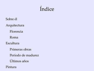 Miguel Ángel Buonarroti fue un renombrado artista del Renacimiento italiano que trabajó principalmente como pintor, escultor y arquitecto. Creó obras maestras como la Capilla Sixtina, el David y el sepulcro de los Médicis. A lo largo de su larga vida, su estilo evolucionó de formas serenas inspiradas en el arte clásico a composiciones más dramáticas y expresivas que reflejaban su profunda espiritualidad.