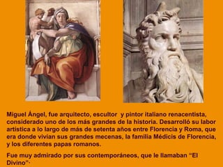 Miguel Ángel fue un renombrado artista italiano del Renacimiento que trabajó como escultor, pintor y arquitecto entre 1475 y 1564. Triunfó en todas las artes, destacando en la escultura y pintura de obras maestras como El David, La Piedad y los frescos de la Capilla Sixtina.