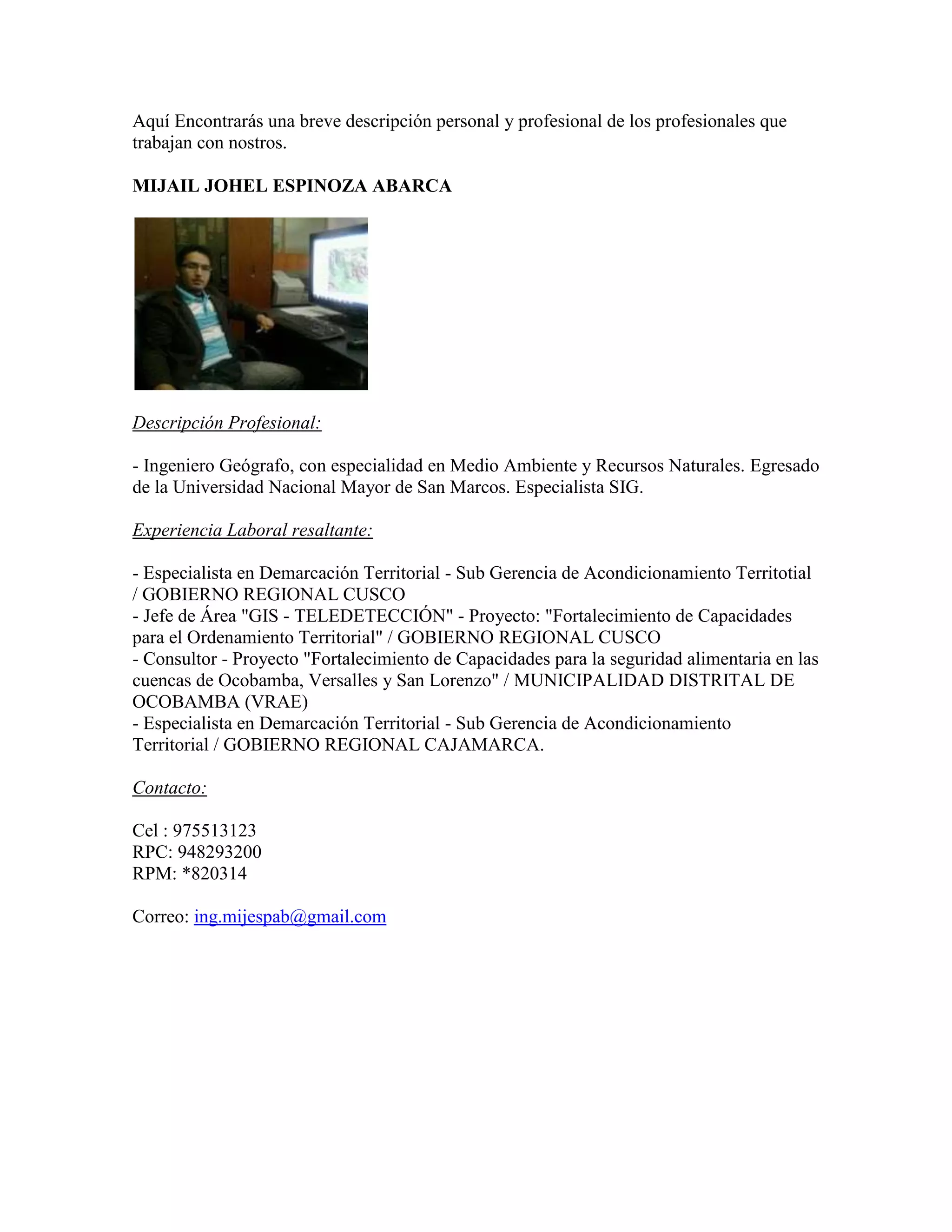 Este documento presenta breves descripciones profesionales de los profesionales que trabajan con la organización. Presenta la información profesional y de contacto de Mijail Johel Espinoza Abarca, un ingeniero geógrafo especializado en medio ambiente y recursos naturales con experiencia en demarcación territorial, SIG y proyectos de ordenamiento territorial y seguridad alimentaria para gobiernos regionales y municipales.