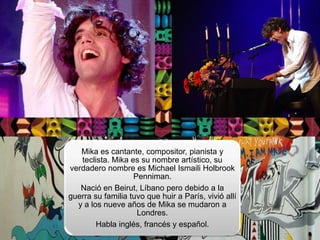 Mika tuvo éxito como cantante pop tras trabajar como cantante de ópera y componer música publicitaria. Aunque muchas discográficas rechazaron sus canciones, medio millón de personas las escuchaban en Internet antes de firmar un contrato en 2007. Ha vendido más de 5,6 millones de discos en todo el mundo.