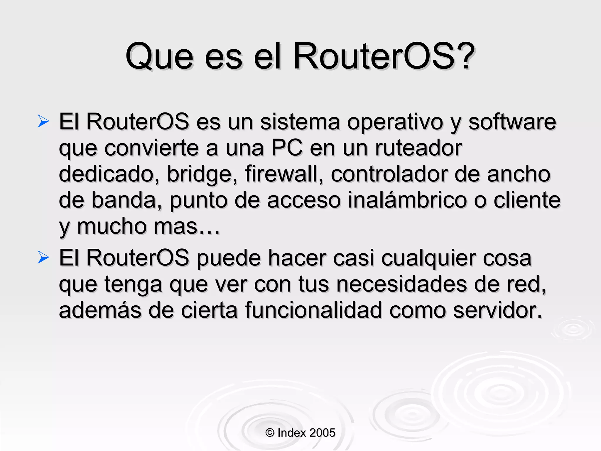 RouterOS convierte una PC en un ruteador, firewall u otros dispositivos de red. Está basado en Linux y se puede ejecutar desde discos o memoria flash. Incluye funciones de ruteo, firewall, servidores y herramientas para administración de red.