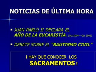 El Papa Juan Pablo II declaró el año 2004-2005 como el Año de la Eucaristía. El documento explica que los siete sacramentos son signos eficaces de gracia instituidos por Jesucristo que nos dan vida divina. Se enfoca en explicar la Eucaristía como la renovación del sacrificio de Cristo en la cruz a través del pan y el vino, y fue instituida por Jesús durante la Última Cena para ser un alimento para nuestra vida sobrenatural.