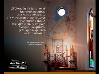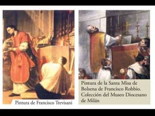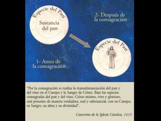 El documento habla sobre la doctrina católica de la Eucaristía. Explica que durante la misa, mediante las palabras de consagración, el pan y el vino se convierten realmente en el cuerpo y la sangre de Cristo a través de un misterio llamado transubstanciación. También menciona que los milagros eucarísticos pueden fortalecer nuestra fe en esta presencia real aunque no son necesarios para creer.