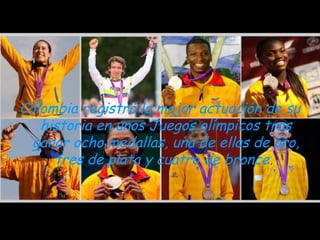 Colombia obtuvo su mejor actuación histórica en los Juegos Olímpicos de Londres 2012, ganando 1 medalla de oro, 3 medallas de plata y 4 medallas de bronce. Las medallas de oro y plata fueron ganadas por Mariana Pajón en ciclismo BMX y Rigoberto Urán y Catherine Ibarguen en atletismo respectivamente. Las medallas de bronce fueron ganadas por Carlos Oquendo y Jacqueline Rentería en ciclismo BMX, Oscar Figueroa en levantamiento de pesas, Oscar
