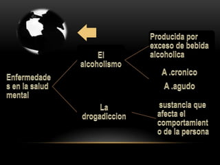 El documento describe factores sociales que afectan la salud mental como el alcoholismo y la drogadicción. El alcoholismo agudo causa temblores y alucinaciones mientras el crónico daña el cerebro y órganos. El alcoholismo deteriora moral y socialmente al individuo y su familia. La drogadicción involucra sustancias químicas naturales o sintéticas que alteran la conciencia y conducta del consumidor causando estados de alegría, excitación e ilusiones.