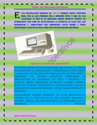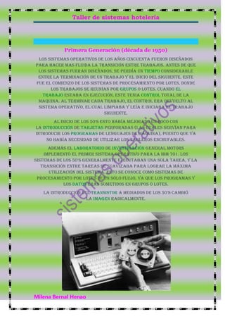 Este documento resume las características de las primeras generaciones de sistemas operativos desde la década de 1950 hasta la actualidad. La primera generación se enfocaba en hacer más fluida la transición entre trabajos para maximizar el uso del sistema. La segunda generación desarrolló sistemas compartidos con multiprogramación y multiprocesamiento. La tercera generación introdujo sistemas más complejos para usos generales. La cuarta generación constituyó el estado actual con redes de computadoras y procesamiento en línea.