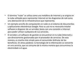 La computación en la nube permite a usuarios y empresas almacenar archivos y usar aplicaciones sin necesidad de instalar software, accediendo a los servicios a través de Internet. Esto ofrece un uso más eficiente de recursos como almacenamiento, memoria y ancho de banda al proveer solo los recursos necesarios. Los servicios y aplicaciones se ejecutan en centros de datos remotos gestionados por proveedores de servicios en la nube.