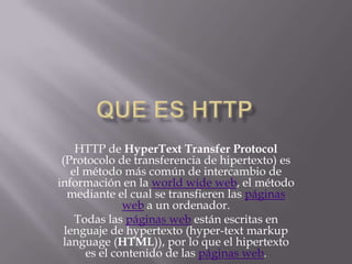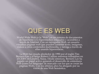 La World Wide Web es un sistema de documentos hipertextuales e hipermedios enlazados accesibles a través de Internet. Los usuarios pueden ver páginas web con texto, imágenes, videos u otros contenidos y navegar entre ellas usando hiperenlaces. La Web fue creada en 1990 por Tim Berners-Lee y Robert Cailliau en el CERN para compartir información. HTTP es el protocolo más común para transferir páginas web y estas están escritas en HTML, por lo que el hipertexto es el contenido de las páginas web.