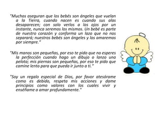 El documento presenta varios mensajes para la futura madre en su baby shower, incluyendo frases sobre los bebés como ángeles y regalos de Dios, una oración al Arcángel San Gabriel pidiendo bendiciones para la madre y el bebé, y una procesión simbólica ofreciendo regalos que representan el cuidado y educación que la madre proveerá.