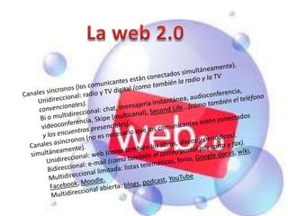 Este documento describe los diferentes tipos de canales de comunicación en la Web 2.0, incluyendo canales síncronos como chat y videoconferencia, y canales asíncronos como correo electrónico y blogs. También explica cómo la Web 2.0 ha permitido que los usuarios dejen de ser meros espectadores y pasen a interactuar y modificar las bases de datos de los sitios web, creando redes sociales como Facebook y Wikipedia donde los usuarios pueden compartir, vender, comprar y asociarse entre sí.