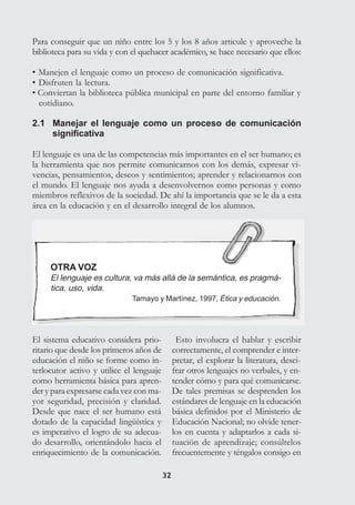 Este documento ofrece recomendaciones para que los niños entre 5 y 8 años disfruten de la lectura y aprovechen la biblioteca. Sugiere que los niños manejen el lenguaje como comunicación, disfruten de la lectura y conviertan la biblioteca en parte de su entorno familiar. Recomienda incentivar la curiosidad de los niños, leer en voz alta para ellos y permitirles escoger libros que les interesen para fomentar el placer por la lectura.
