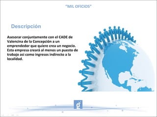Este documento describe el proyecto "Mil Oficios" que tiene como objetivo crear una empresa en el sector de servicios en Valencina de la Concepción a través de asesoramiento con el CADE local. El proyecto busca transformar una idea de negocio en un proyecto viable, brindar recursos y asesoramiento TIC para establecer la empresa, la cual generará al menos un puesto de trabajo y beneficios indirectos para la localidad.