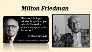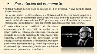 Milton Friedman fue un economista estadounidense que nació en 1912. Recibió el Premio Nobel de Economía en 1976. Friedman fue fundador de la teoría monetarista y creía en el libre mercado y la desregulación económica. Aplicó sus teorías en Chile durante la dictadura militar, promoviendo reformas como la privatización de pensiones. Sus ideas sobre el consumo y el ingreso permanente han tenido gran influencia en el análisis macroeconómico.